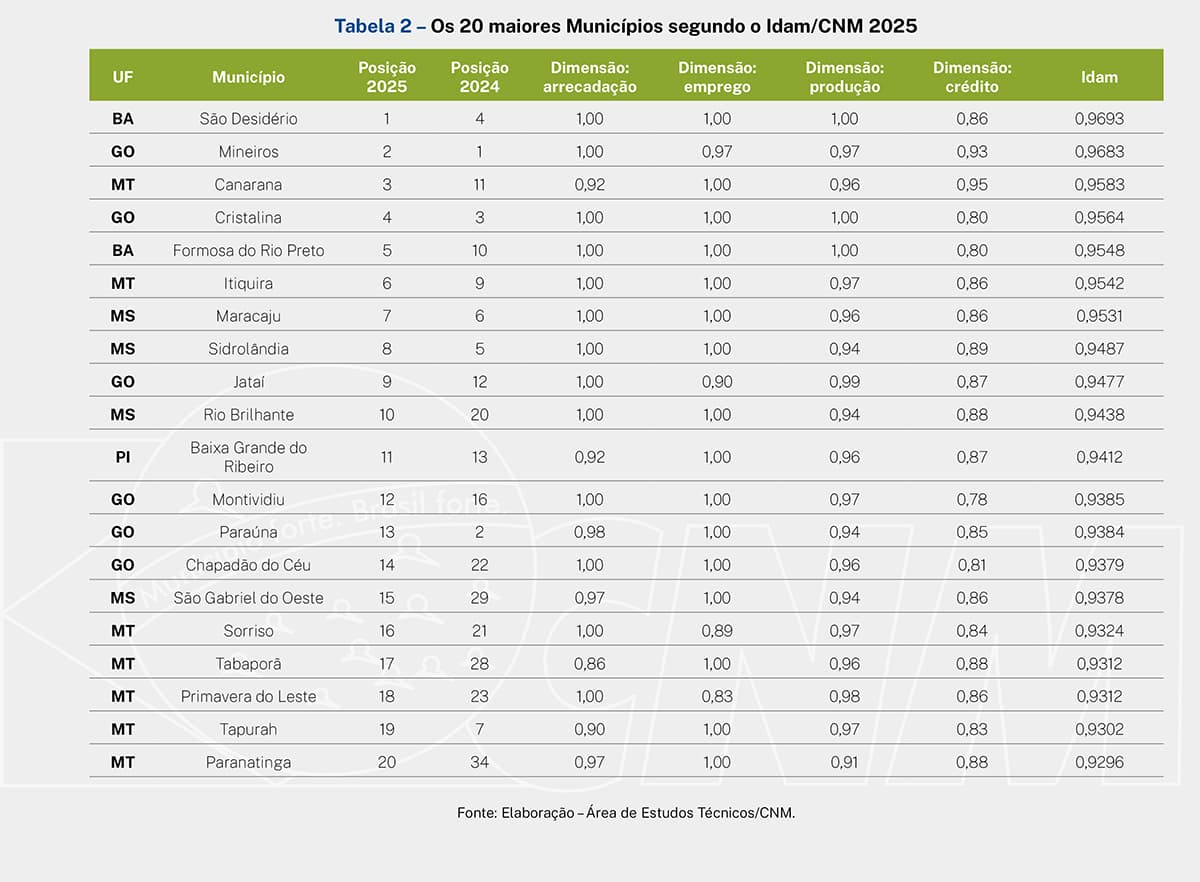 Entre os 20 primeiros colocados só há municípios da Bahia (2), Goiás (6), Mato Grosso (7), Mato Grosso do Sul (4) e um do Piauí. No Idam/2025, 13 municípios elevaram a sua classificação de desenvolvimento alto para muito alto e outros 13 foram rebaixados de muito alto para alto.