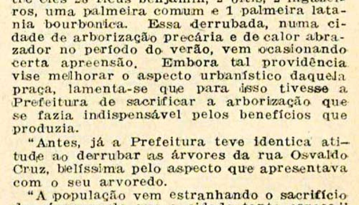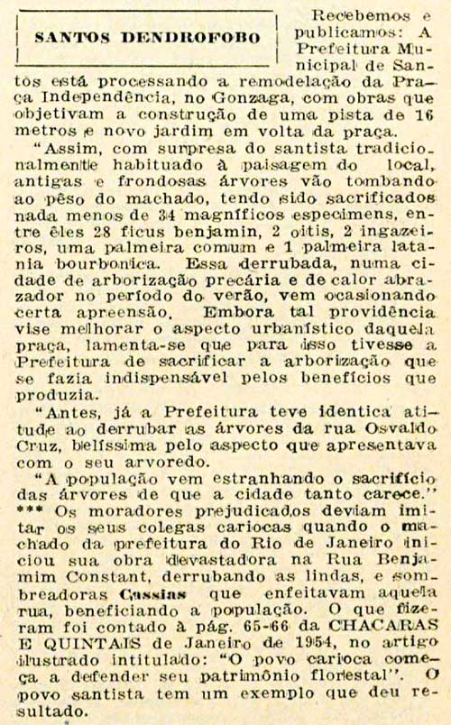 Em meados do século passado, leitores da revista ‘Chácaras e Quintais’ denunciavam a derrubada de árvores na cidade de Santos, no litoral paulista, numa atitude dendrofóbica da prefeitura local, que sucumbia, ao peso do machado, 34 frondosas espécimes da Praça Independência. O prefeito à época, Domingos Mazzini (UDN), defendeu certamente o sacrifício, a bem do urbanismo.