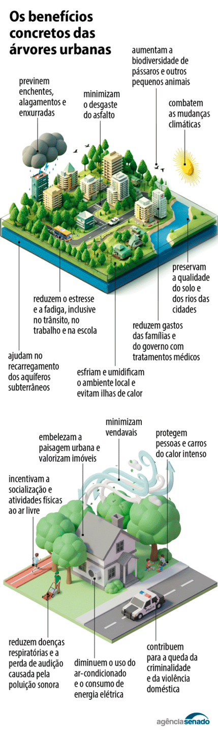 Para suprir a lacuna, o Congresso estuda dois projetos de lei de conteúdo semelhante que criam a Política Nacional de Arborização Urbana. Um deles (PL 3.113/2023) foi apresentado pelo senador Efraim Filho (União-PB). O outro (PL 4.309/2021), pelo ex-deputado Rodrigo Agostinho, atual presidente do Instituto Brasileiro do Meio Ambiente e Recursos Renováveis (Ibama). Os projetos estão em análise na Comissão de Constituição, Justiça e Cidadania (CCJ) de suas respectivas casas.