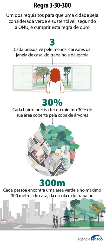 O Plano Nacional de Arborização Urbana a ser lançado pelo Ministério do Meio Ambiente inclui o esquema chamado 3-30-300, considerado pela ONU regra de ouro da arborização urbana. Para ser sustentável, entre outros requisitos, a cidade precisa permitir que cada habitante veja da janela de casa, do trabalho ou da escola pelo menos três árvores, que a copa cubra no mínimo 30% da área de cada bairro e que haja uma praça, parque, jardim ou gramado de tamanho considerável a até 300 metros (aproximadamente três quadras) da casa, do trabalho ou da escola de cada pessoa.