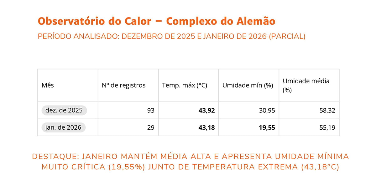 O Observatório do Calor, instalado de forma pioneira no Complexo do Alemão, na zona norte, fez 710 aferições de temperatura entre setembro de 2025 e janeiro de 2026.