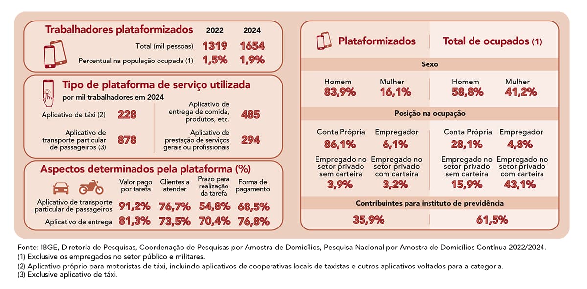 Os dados fazem parte do módulo sobre trabalho por meio de plataformas digitais da Pesquisa Nacional por Amostra de Domicílios (Pnad) Contínua, divulgada pelo Instituto Brasileiro de Geografia e Estatística (IBGE).