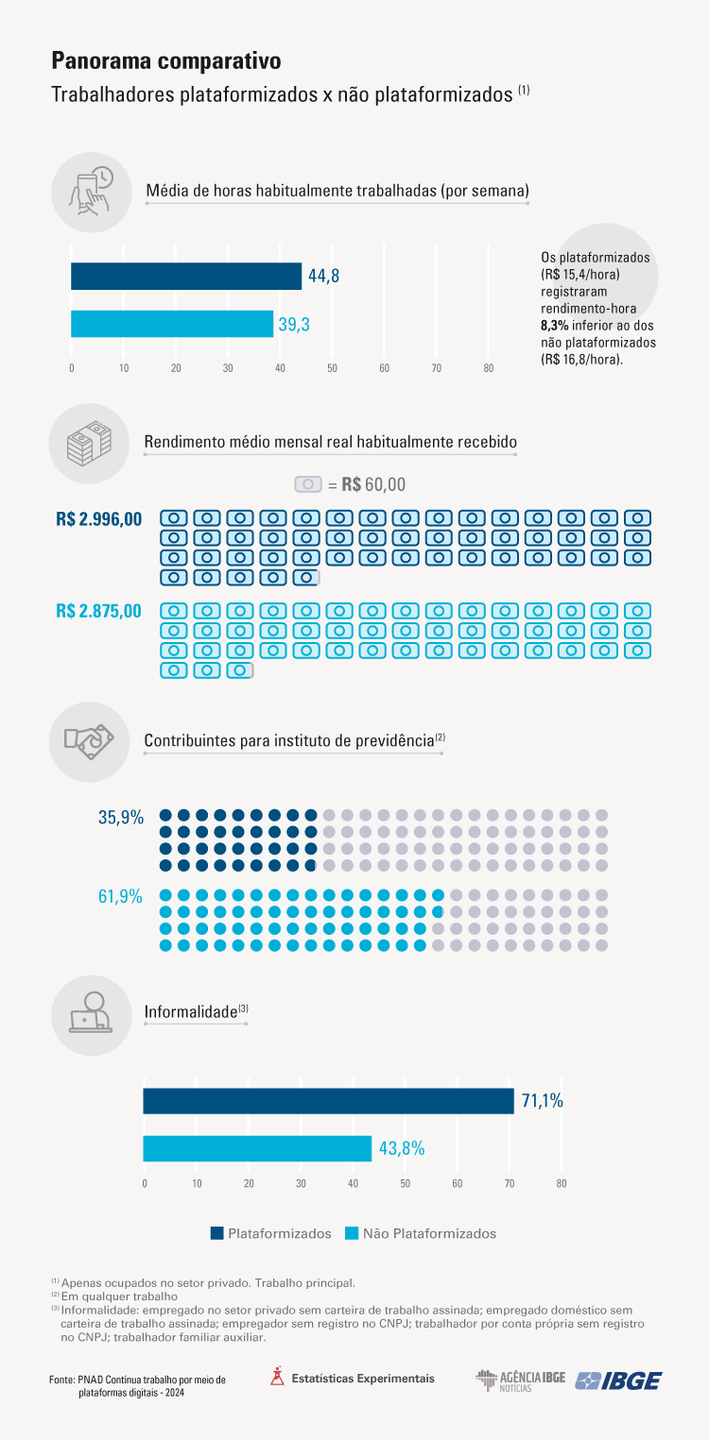 Os ocupados por plataformas trabalhavam 45,2 horas semanais em média, superando em 3,9 horas a jornada dos não plataformizados, de 41,3 horas na semana.