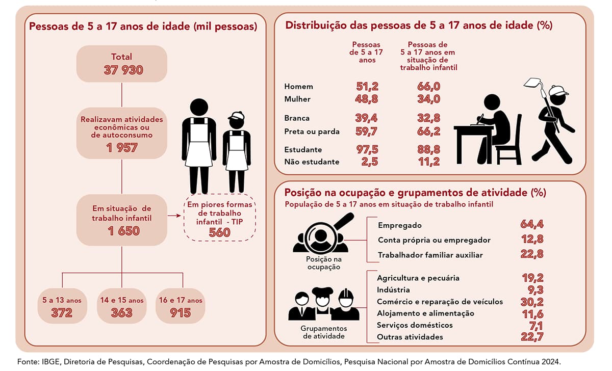 A pesquisa do IBGE traz um retrato da situação do trabalho infantil no país, que atingiu 1,65 milhão de brasileiros em 2024.