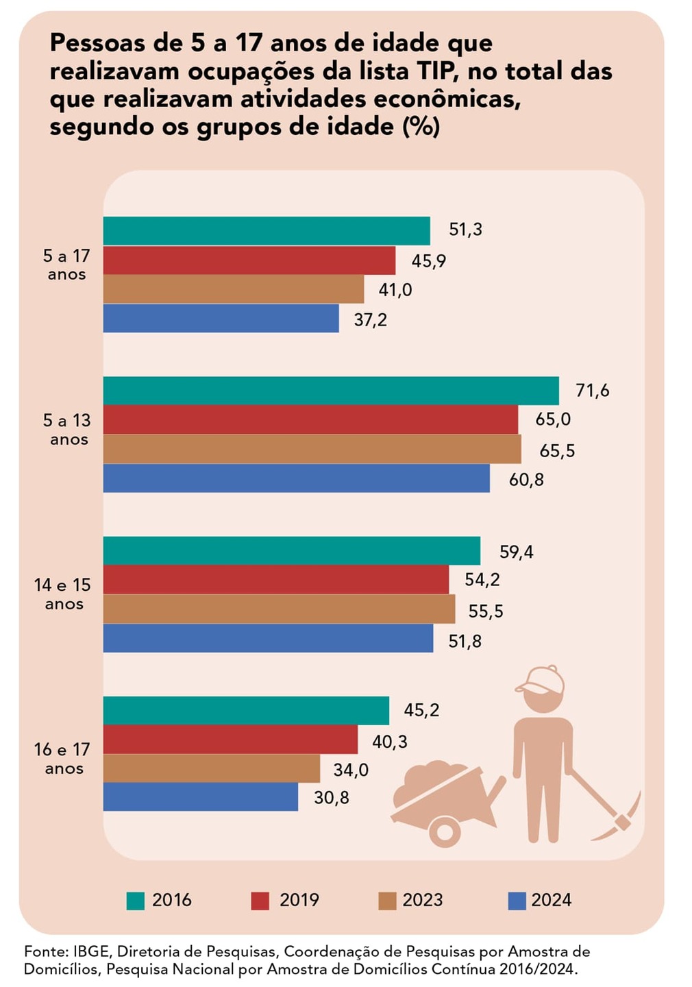 Em 2024, o país tinha 560 mil pessoas de 5 a 17 anos na Lista TIP. Esse resultado representa queda de 39% em relação a 2016, quando o Brasil tinha quase 1 milhão (919 mil) de crianças e adolescentes nessas atividades.