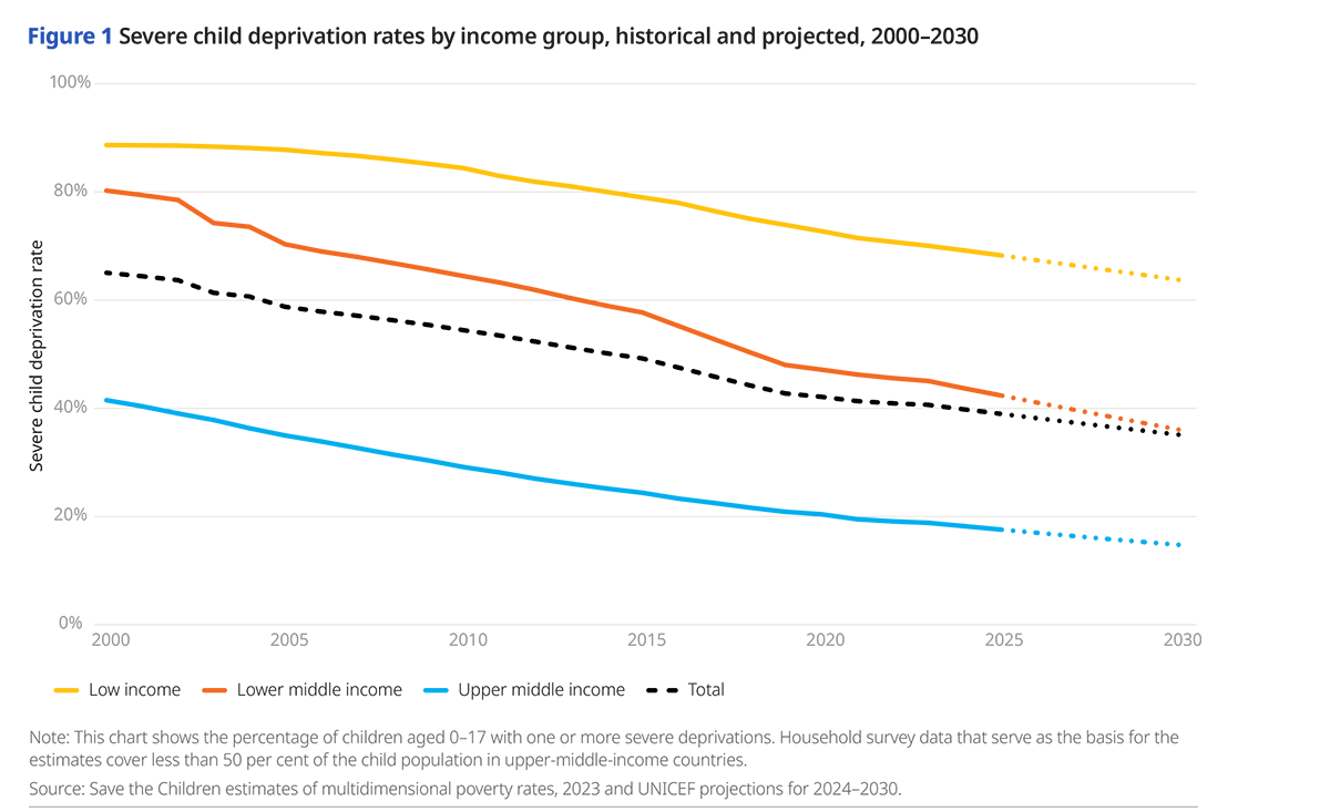 No entanto, o progresso está estagnado. Conflitos, crises climáticas e ambientais, mudanças demográficas, aumento da dívida nacional e ampliação das divisões tecnológicas estão agravando a pobreza. Ao mesmo tempo, cortes sem precedentes na ajuda humanitária internacional podem aprofundar a privação infantil nesses países.